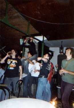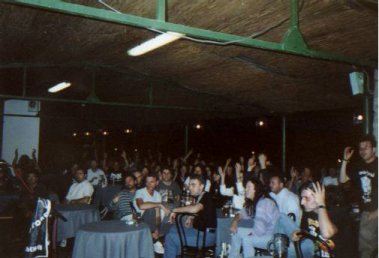 am 20.7.01 ihre erste Show in Italien im altehrwürdigen "La Tasca". Eine bestuhlte Örtlichkeit, ohne Bühne... Zunächst war das ziemlich seltsam und ungewohnt für uns, aber nach dem ersten Song war alles Eis gebrochen... Die Meute machte Party ohne Ende!!! Nach der Show kam der Wirt zu uns und meinte: "Ich mach seit 20 Jahren hier Konzerte, aber sowas wie heute nacht gab es noch nie...!". Ein großartiger Tourauftakt...